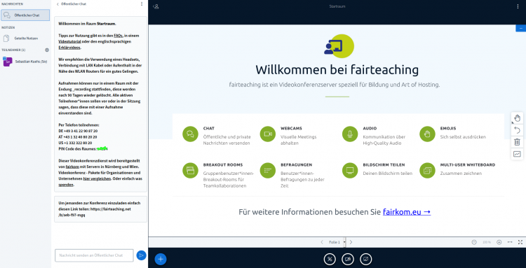 Wir starten kommenden Montag, 19.10.2020, von 16 bis 17 Uhr mit unserer BigBlueButton Instanz fairteaching. Einfach mit dem Web-Browser folgenden Raum aufrufen: https://fairteaching.net/b/rol-khm-g99 und los geht's. Wir erklären dort die wesentlichen Funktionen von BigBlueButton, wie die Handhabung von Präsentationen, Breakout Rooms, dem Whiteboard u.v.m. Für Fragen & Antworten bleibt dann auch noch Zeit.