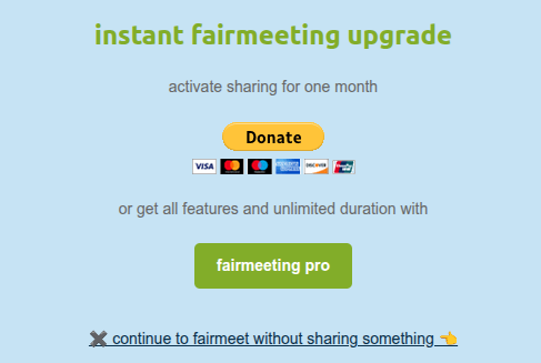 With the instant upgrade, screen sharing is activated for 30 days and there will be also no more pop-up asking for a donation every 50 minutes 🕐. You get full features without begging 😉 when you subscribe to a fairmeeting pro package.