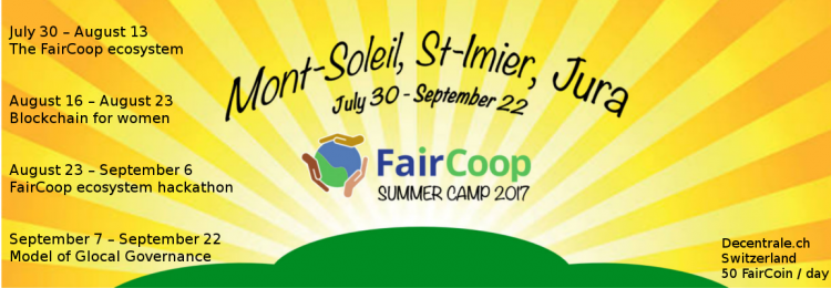 Im Aktivitätsfeld Social Design engagiert sich fairkom für die Kryptowährung FairCoin. Nun gibt es in der Schweiz bei unseren Freunden im Jura mit FairCoop Aktivisten aus ganz Europa und vielleicht auch einigen aus anderen Kontinenten ein Sommercamp mit mehreren Themenschwerpunkten: Organisationsentwicklung, Vermittlung, Technik. Einige fairkom Mitglieder aus Dornbirn fahren voraussichtlich am 23.-26.8.2017 hin und sind mit dabei.