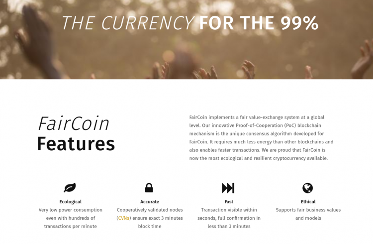 Mit FairCoins sollten genossenschaftlich organisierte Betriebe ein neues Tauschmittel bekommen, mit dem sie global handeln können. Das Team der fairkom Gesellschaft kümmerte sich um Technik und Kommunikation. Ein Software Spezialist aus Dornbirn entwickelte dafür einen besonders energiesparenden Blockchain Mechanismus, die bis heute technisch perfekt funktioniert und nur etwa 200 Watt benötigt. FairCoins hatten 2018 mit einem Gegenwert von mehr als einem Euro einen Höhenflug und wurden in Spanien, Griechenland, Italien, aber auch in Mittelamerika oder von Kurden genutzt um Waren und Dienstleistungen zu handeln. Doch die Zusammenarbeit mit einigen Anarchisten, die meinten sie können Monopoly - Bank spielen, gestaltete sich als schwierig und die Community fiel auseinander.